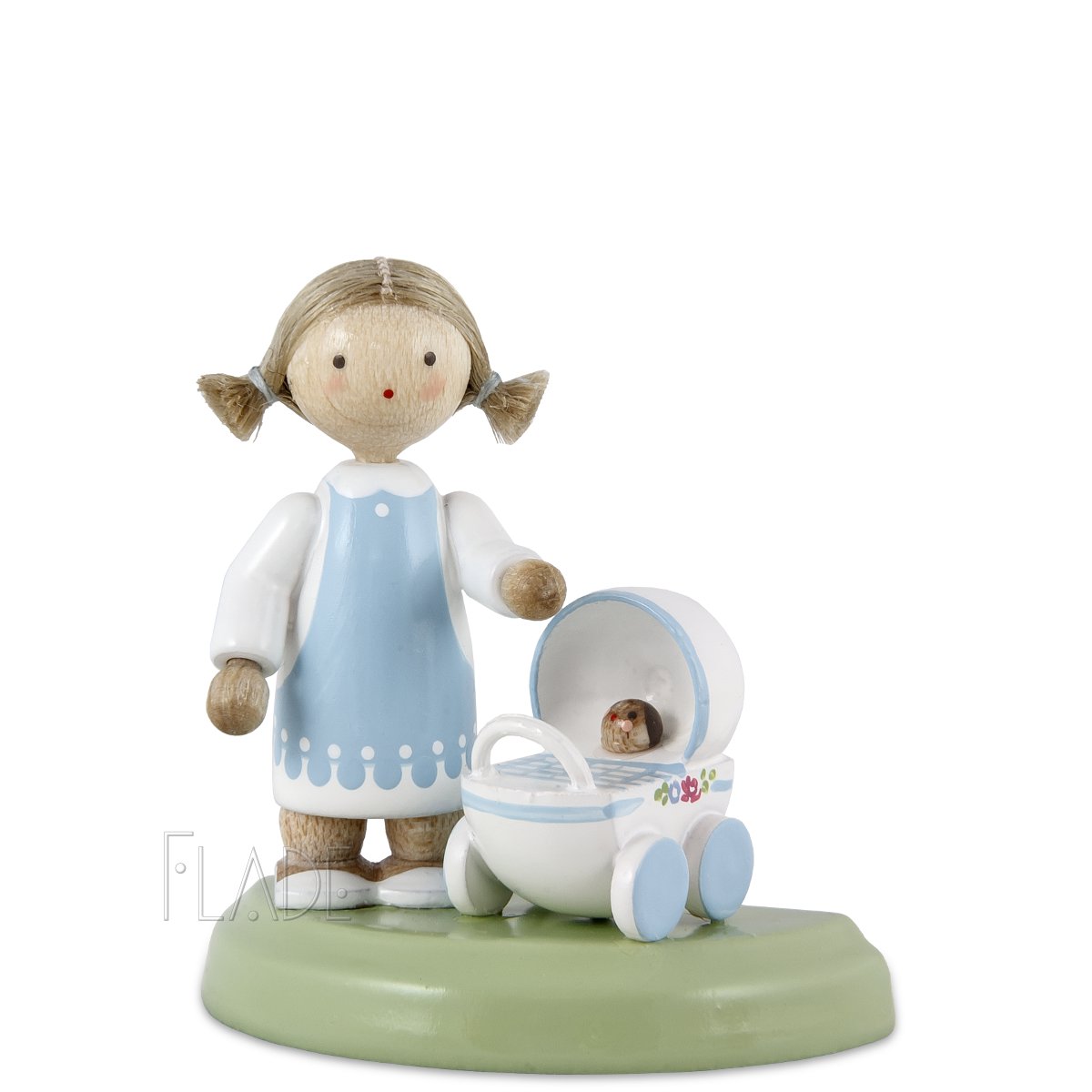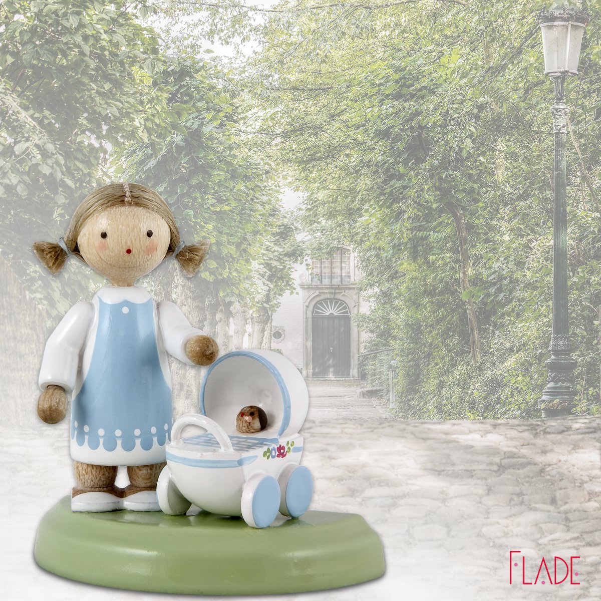 Ein Mädchen mit Puppenwagen und Baby drin – das war vor etlichen Jahren der Wunsch einer Mitarbeiterin. Blau sollte der Wagen sein, denn es war ein kleiner Junge auf die Welt gekommen, und die Mama sollte das FLADE-Kind geschenkt bekommen zur Geburt ihres Babys. Die Name der Mama war Anne und der Name des Babys war Paul…