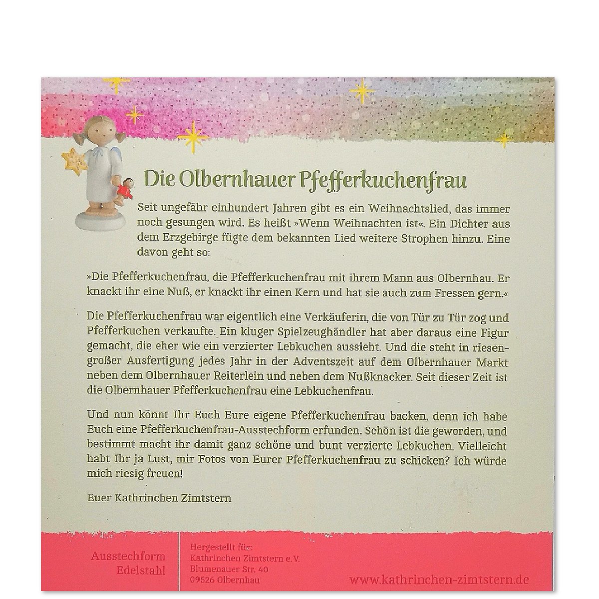 Wollt Ihr Euch eine süße Pfefferkuchenfrau backen? Aus Keksteig oder aus Pfefferkuchenteig? Unser Kathrinchen Zimtstern hat Ausstechformen erfunden. Aber nicht irgendwelche, sondern die drei Olbernhauer Marktfiguren. Seit genau siebzig Jahren stehen die Pfefferkuchenfrau, der Nußknacker und das Reiterlein in der Adventszeit auf dem Marktplatz. Überlebensgroßes Spielzeug, geliebt von den Olbernhauern und ihren Gästen. Auf der Rückseite der Verpackung erzählt Kathrinchen Zimtstern die Geschichte der Olbernhauer Pfefferkuchenfrau.