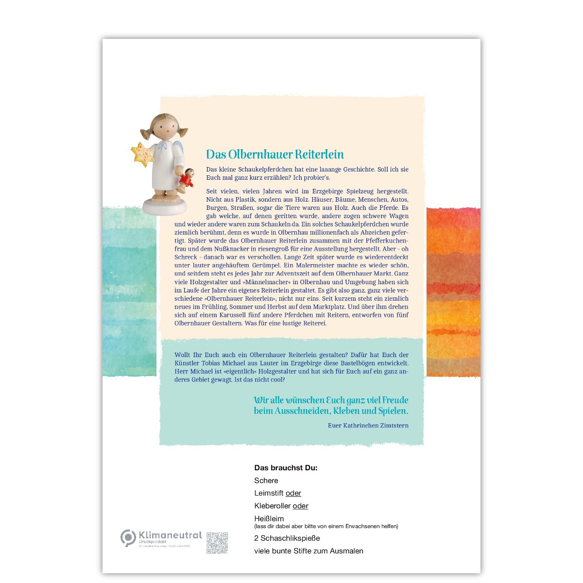 Es gibt viele, viele Olbernhauer Reiterlein, und jetzt auch welche zum Selbermachen. Dieser freche Kerl möchte noch bunt werden. Nehmt Stifte oder Farbe und verpasst ihm ein fröhliches Outfit. Dann geht es ans Ausschneiden. Wenn das Pferdchen fertig geklebt ist, nickt der Reiter beim Schaukeln mit dem Kopf und schlenkert mit den Beinen.