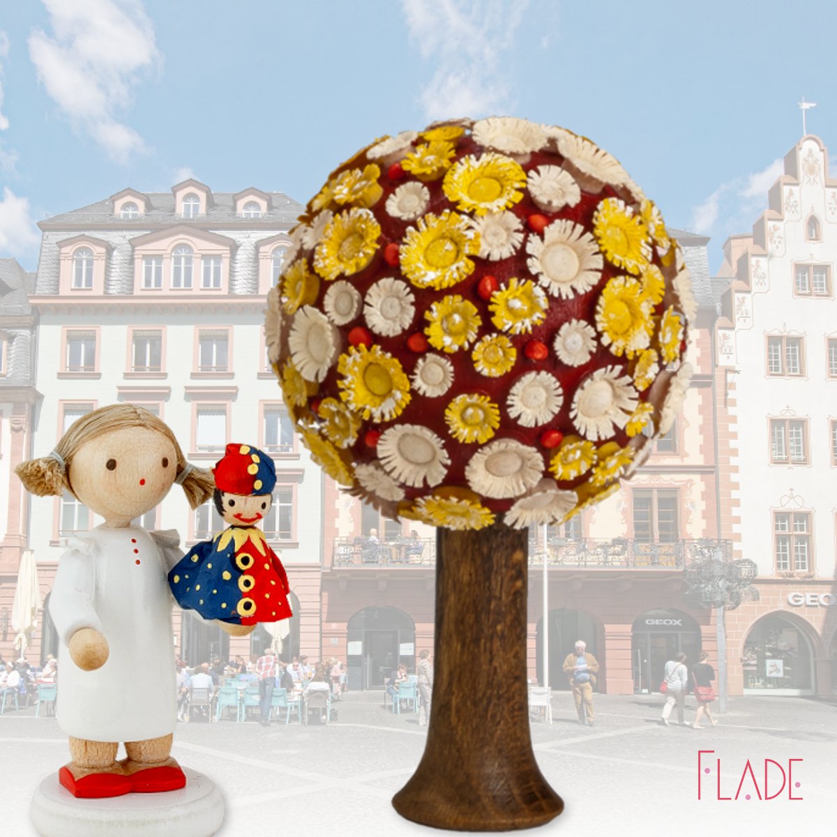 Unsere Blütenbäume sind doch eine Schau! Jede der gedrechselten und gefärbten Blüten wird einzeln mit der Pinzette auf die Holzkugel geleimt. Man braucht viel Geschick und ein gutes Gefühl für Farbe und Form, damit ein solches Kunstwerk entstehen kann. Jeder Baum ist anders und damit ein Unikat.
