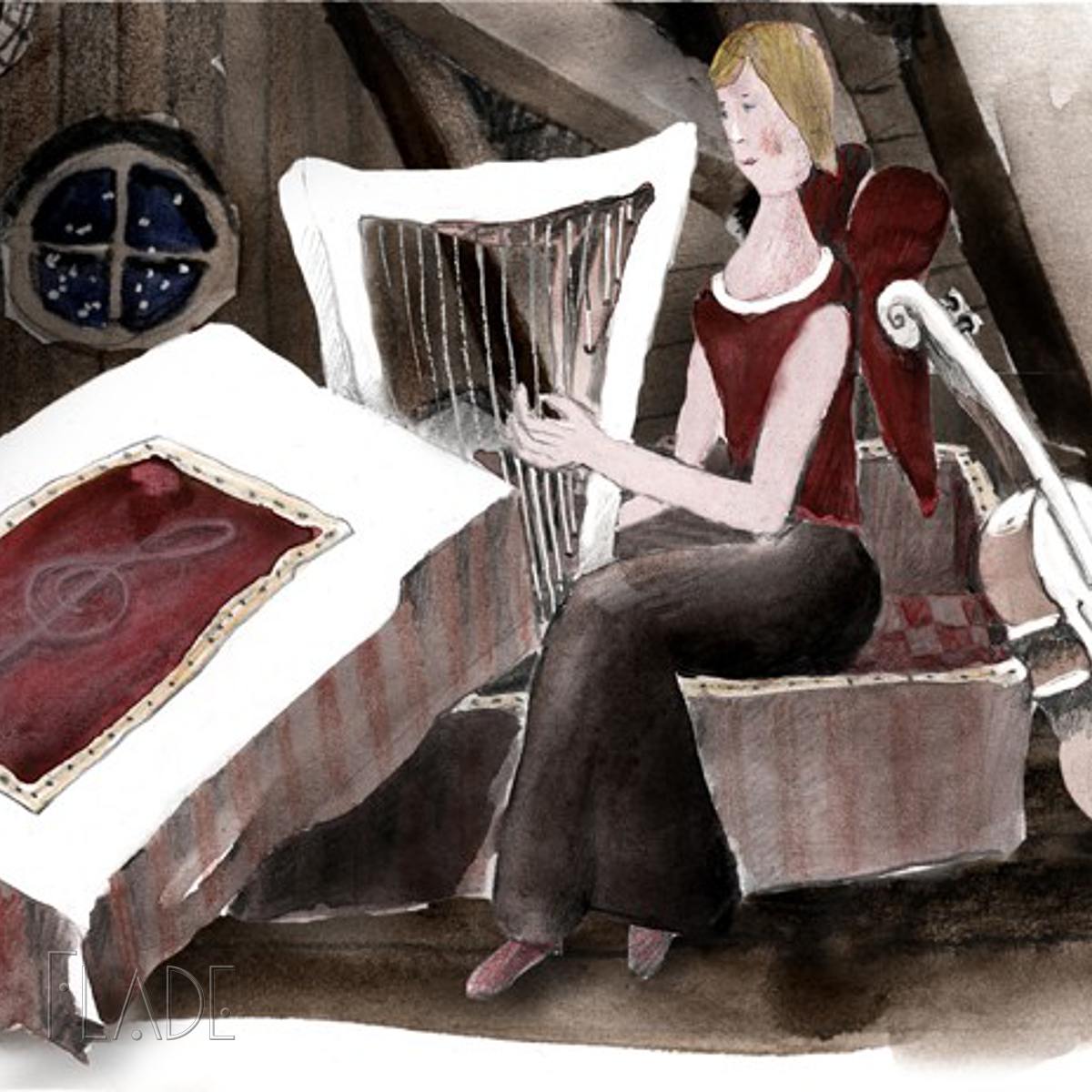 Laura Lindenholz ist eine anmutige Engelsdame, die die Harfe spielt. Auch diese Figur ist Teil der Geschichte um das kleine mutige Engelchen Kathrinchen Zimtstern. Ich glaube, sie hat sich in den schüchternen Johann verliebt…