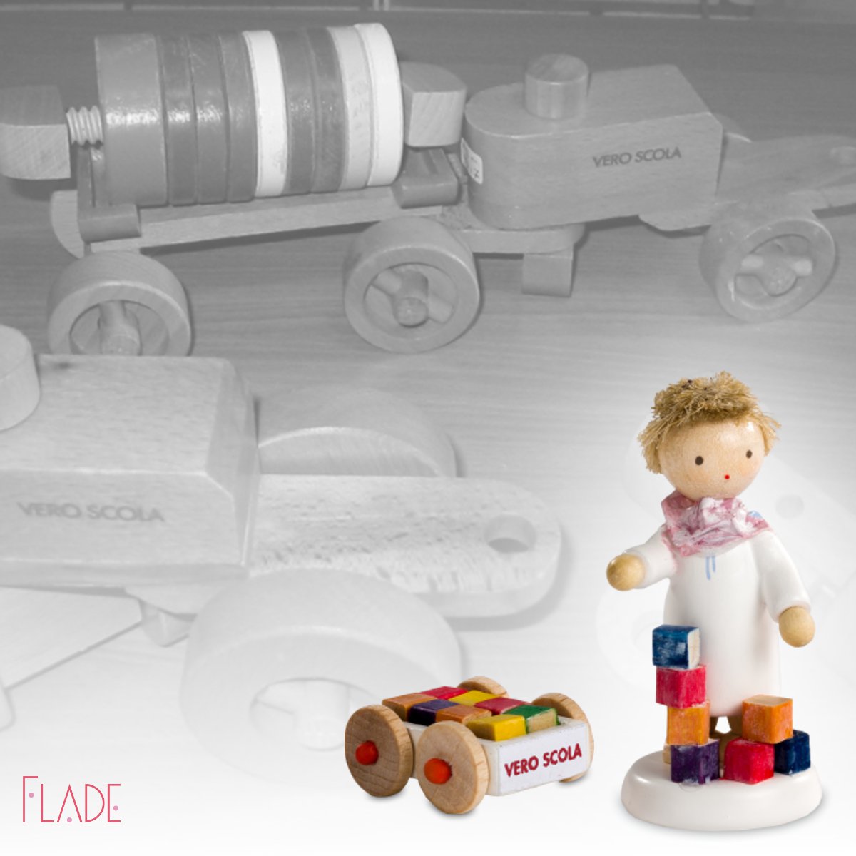 Seit über 150 Jahren werden in Blumenau Baukästen hergestellt, also irgendwie schon immer. In meiner beruflichen Vergangenheit haben Baukästen und Spielzeug für Vorschulkinder eine sehr große Rolle gespielt. Vielleicht kann sich jemand an die Serie VERRO SCOLA erinnern? Ich habe verschiedene Dinge davon gesammelt und nun hat auch eins meiner Engelchen einen solchen Bauwagen bei sich und spielt mit den bunten Klötzen.