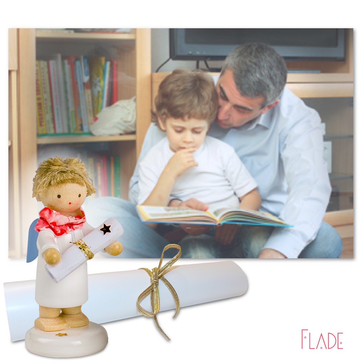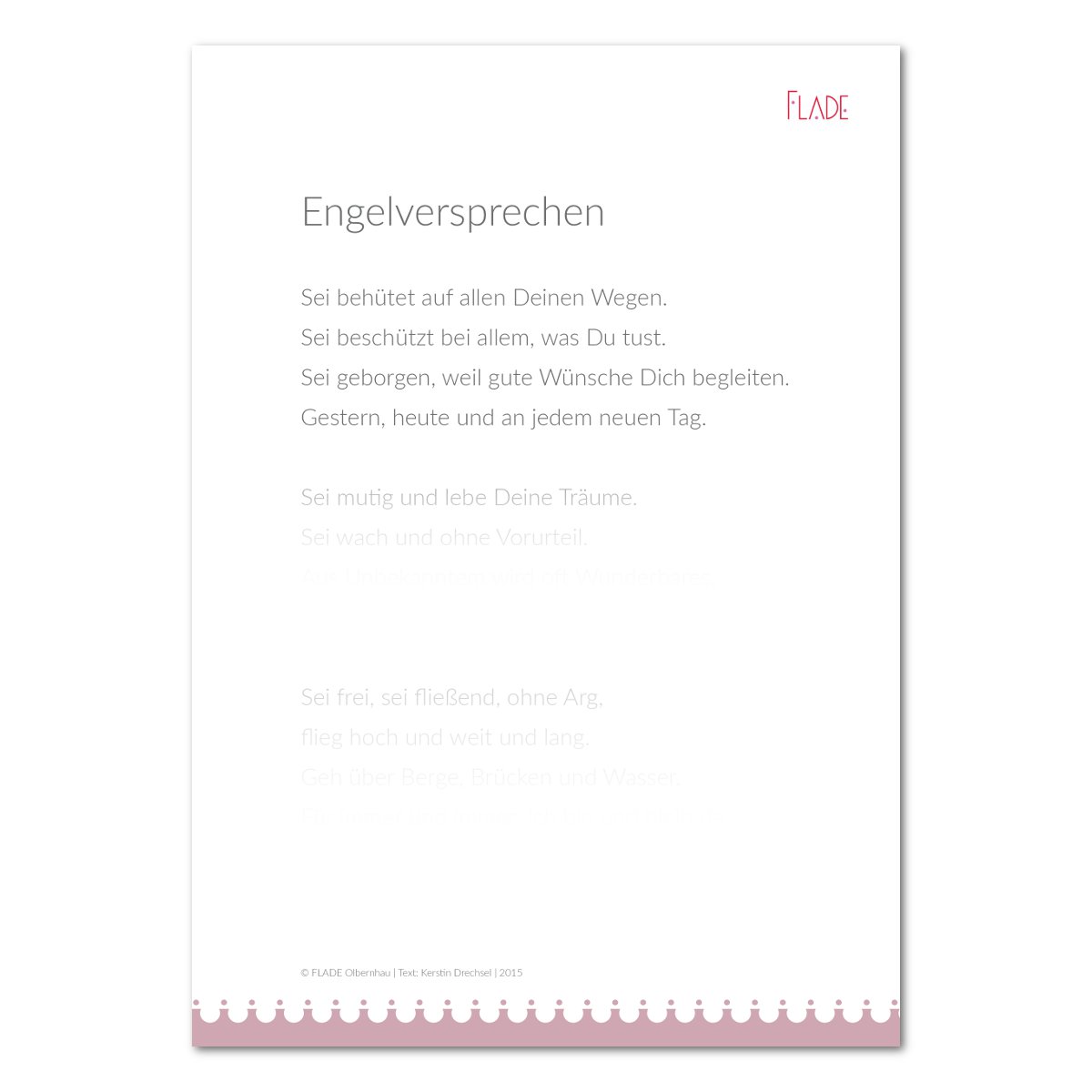 Das Engelchen trägt eine Rolle bei sich. Was wird da wohl drin stehen? Ein Rezept vielleicht? Oder ein Glückwunsch? Es ist ein Gedicht, ein „Engelversprechen“. Der Engel ist ein Schutzengel und verspricht seinem Besitzer oder seiner Besitzerin: „…Für immer und immer. Ich bin für Dich da.“ Das ganze Gedicht „Engelversprechen“ in gedruckter Form, im Format A5, gerollt, und mit Goldbändchen gehört selbstverständlich mit dazu.