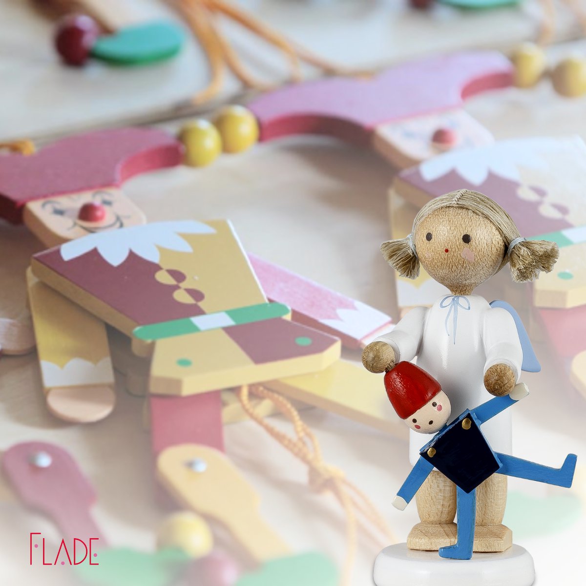 Als mein Vater 1990 die allerersten FLADE-Engelchen für mich entwarf, wurde ein “Gesetz” aufgestellt: Unsere Engelchen haben Spielzeug in der Hand – für Musikinstrumente sind andere zuständig. Und deshalb gehörte zu dieser ersten Serie eben auch der Engel mit Hampelmann.