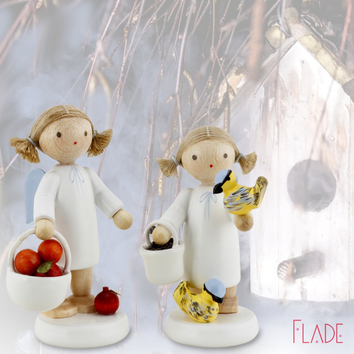Das Engelchen hat einen Eimer mit Futter für die hungernden Vögel bei sich und möchte wohl zum Vogelhäuschen gehen. Aber da kommen schon zwei Meisen angeflattert und lassen sich füttern. Sie sind ganz zutraulich und fressen aus der Hand. Aber das erleben wahrscheinlich nur Engelchen…