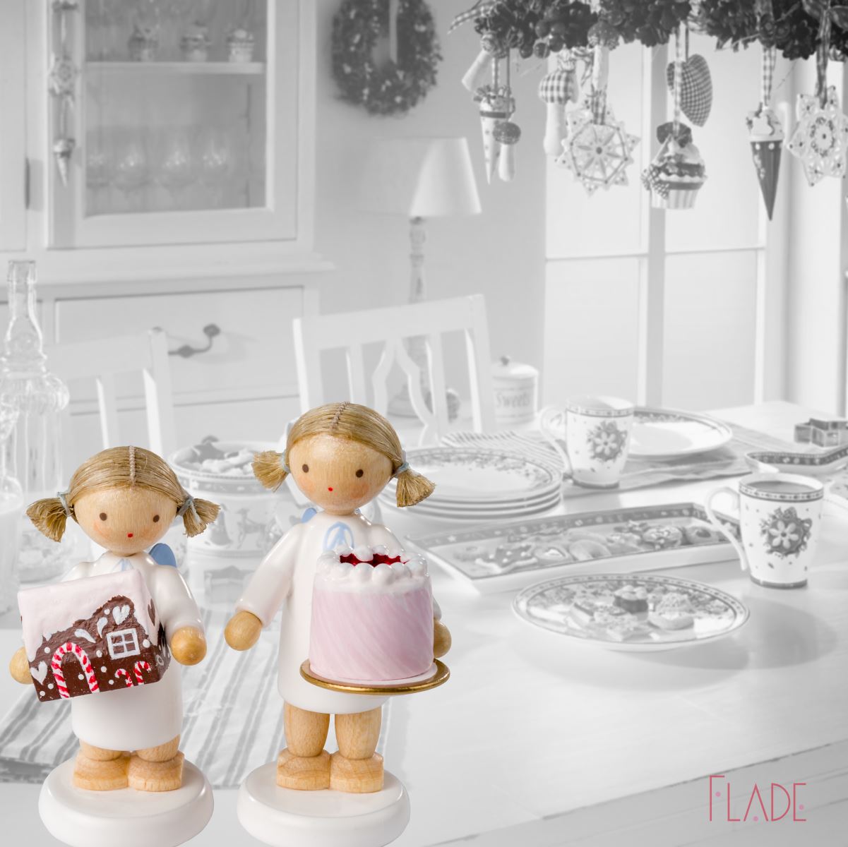 Engelchen naschen unheimlich gern – wir übrigens auch. Weihnachtsgebäck, Zuckerzeug, kandierte Äpfel, Stollen…Ein fein verziertes Pfefferkuchenhaus und eine sahnige Festtagstorte ergänzt die Reihe der Engelchen mit süßem Beiwerk. Uns ist schon mal das Wasser im Mund zusammengelaufen, wir haben alle Appetit auf ein Stück Himbeersahnetorte bekommen….