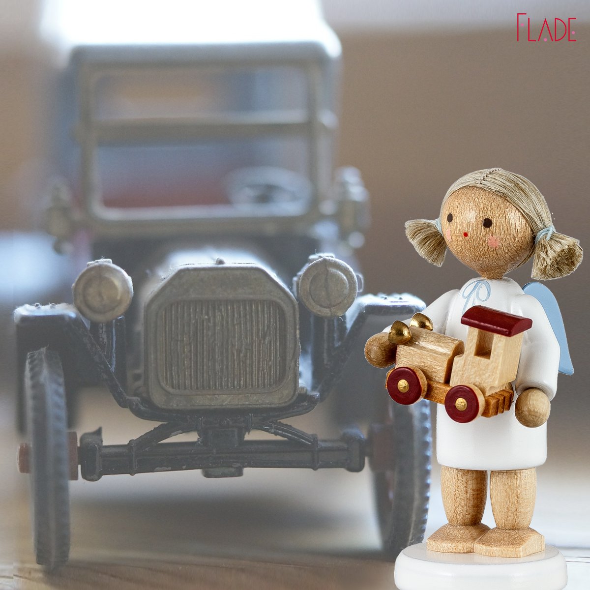 Alte Autos und obendrein noch aus Holz gemacht haben bis heute ihre ganz eigene Faszination. Kinder fühlen sich magisch angezogen und spielen lange und ausdauernd damit. Es klappert, wenn sich die Räder drehen, es gibt ein unverwechselbares Geräusch, wenn man damit über den Fußboden rattert. Und es quitscht und rumpelt so herrlich! Das Engelchen holt sie hervor, diese Magie.