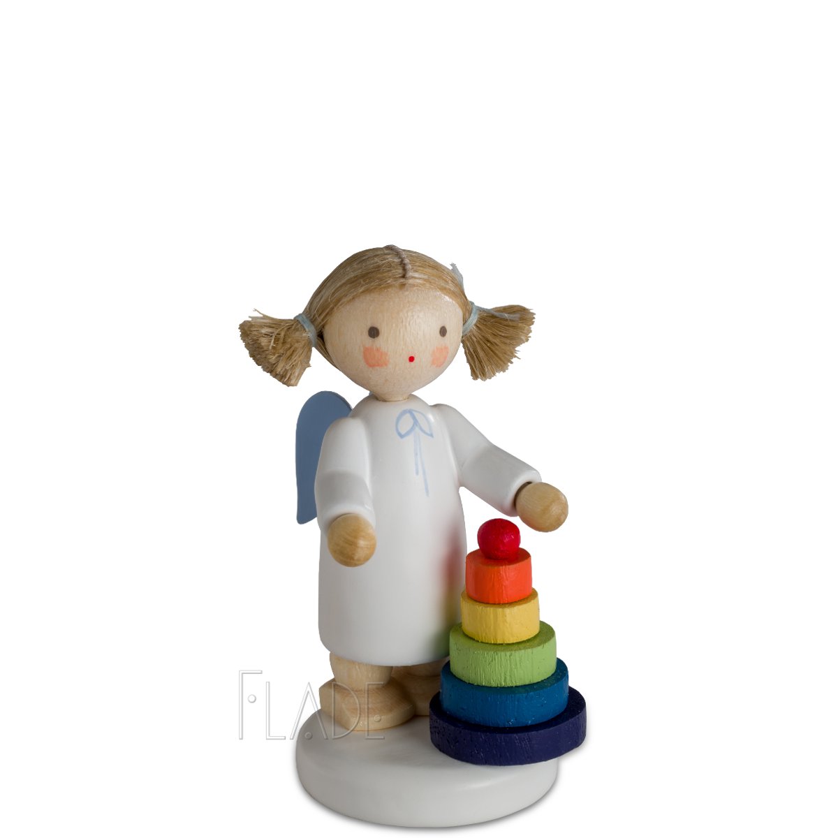 Einen Steckturm oder eine Steckpyramide ist ein ganz altes Holzspielzeug für Kleinkinder. Unterschiedlich große und farbige Scheiben sollen der Größe nach auf einen Stab gesteckt werden. Das ist schwer für die Winzlinge und erfordert viel Geduld und Übung. Ob mein Engelchen mit dabei helfen wird, dass die Kleinen schnell lernen werden, wie man das richtig macht?