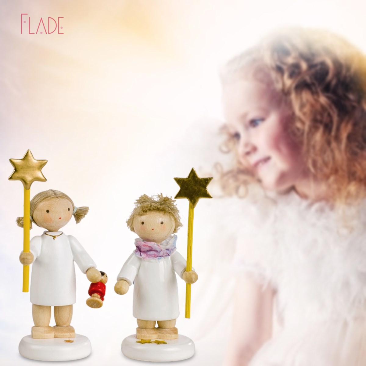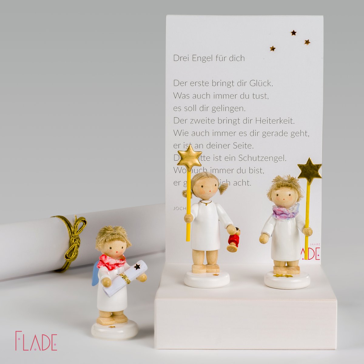Die Kulisse mit dem schönen Zeilen „Drei Engel für Dich“ von Jochen Mariss verleiht den Flachshaarengelchen eine zusätzliche Bedeutung. Sie kann auch einzeln erworben und zusammen mit drei anderen Flade-Engelchen ein besonderes Geschenk sein.