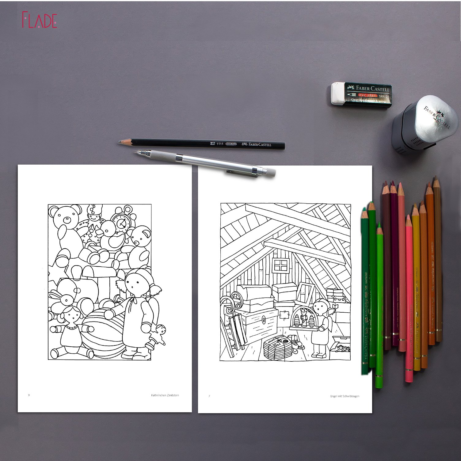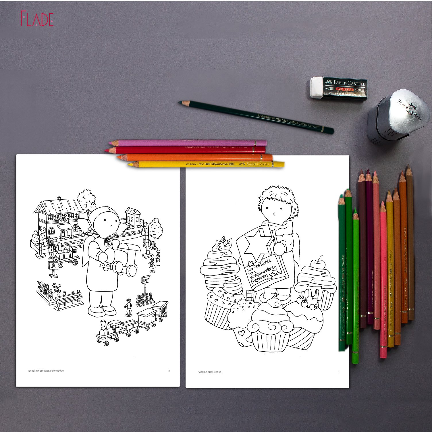 Nun ist es da, das zweite Malbuch. – ein weihnachtliches. In diesem Heft sind die FLADE-Flachshaarengelchen in zauberhafte Kulissen gestellt. Da ist der Weihnachtsmarkt, das Pfefferkuchenhaus, eine Spielzeuglandschaft, ein Sternenhimmel und noch ganz viel mehr. Wunderbar! Unser Kathrinchen Zimtstern ist dabei und die beiden treuen Freunde, aber auch verschiedene Winterkinder. Jede Seite ist eine Geschichte für sich. Wir alle sind uns sicher, dass nicht nur Kinder große Freude am Gestalten haben werden. Wer weiß, vielleicht coloriert der Eine oder Andere die detailreichen Bilder mit dem Pinsel?