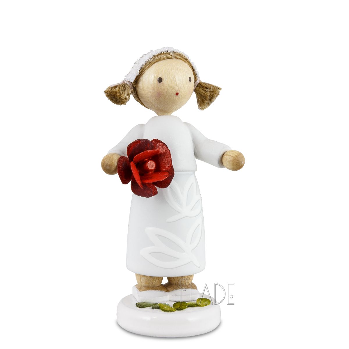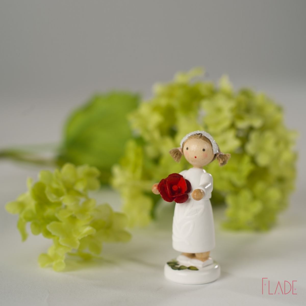 „Flower fairies“ ist ein englisches Kinderbuch mit ganz wunderbaren Illustrationen von Blumen und von Feen, die in den Blumen leben. Das war die Inspiration zu einer neuen Serie. Blumen sprechen und jede Blume hat ihre eigene Bedeutung. Es gibt richtige Wörterbücher für die Sprache der Blumen. Die Bedeutung der roten Rose kennt wohl jeder. Sie symbolisiert die Liebe. Das Mädchen in ihrem zarten Spitzenkleid könnte also eine ganz eindeutige Botschaft überbringen