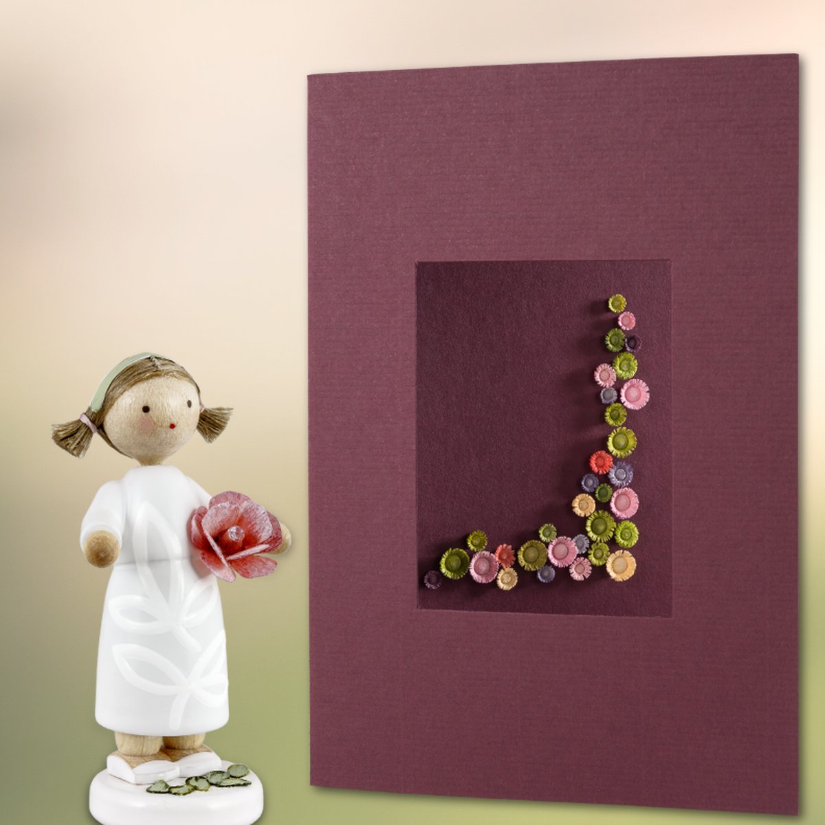 Der Gutschein selbst ist schon etwas Besonderes. Mehr als dreißig gedrechselte Blumen sind zu einem zauberhaften Blütenbild arrangiert und bilden den Hintergrund für ein Flachshaarkind oder eine ganze Szenerie an FLADE Kindern.