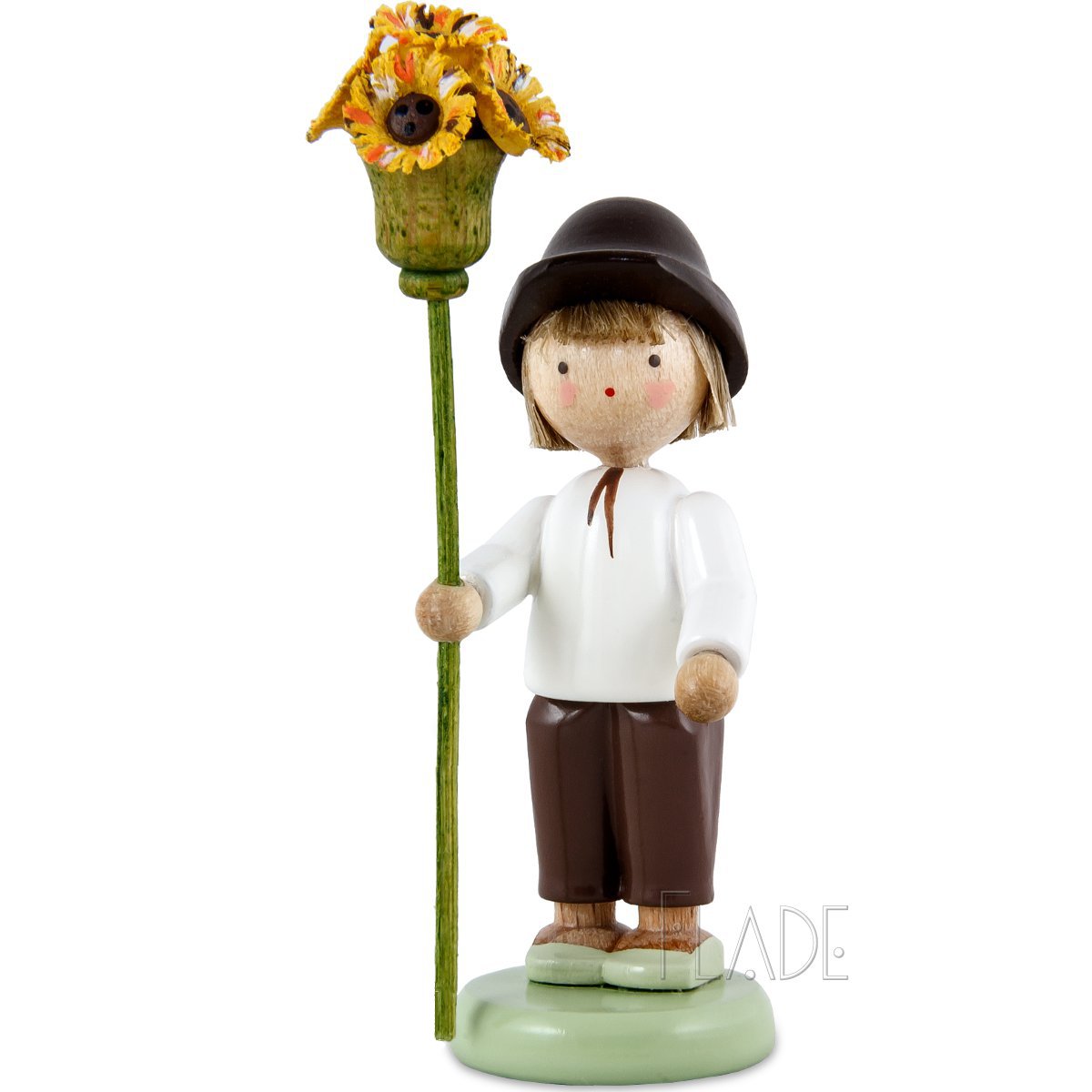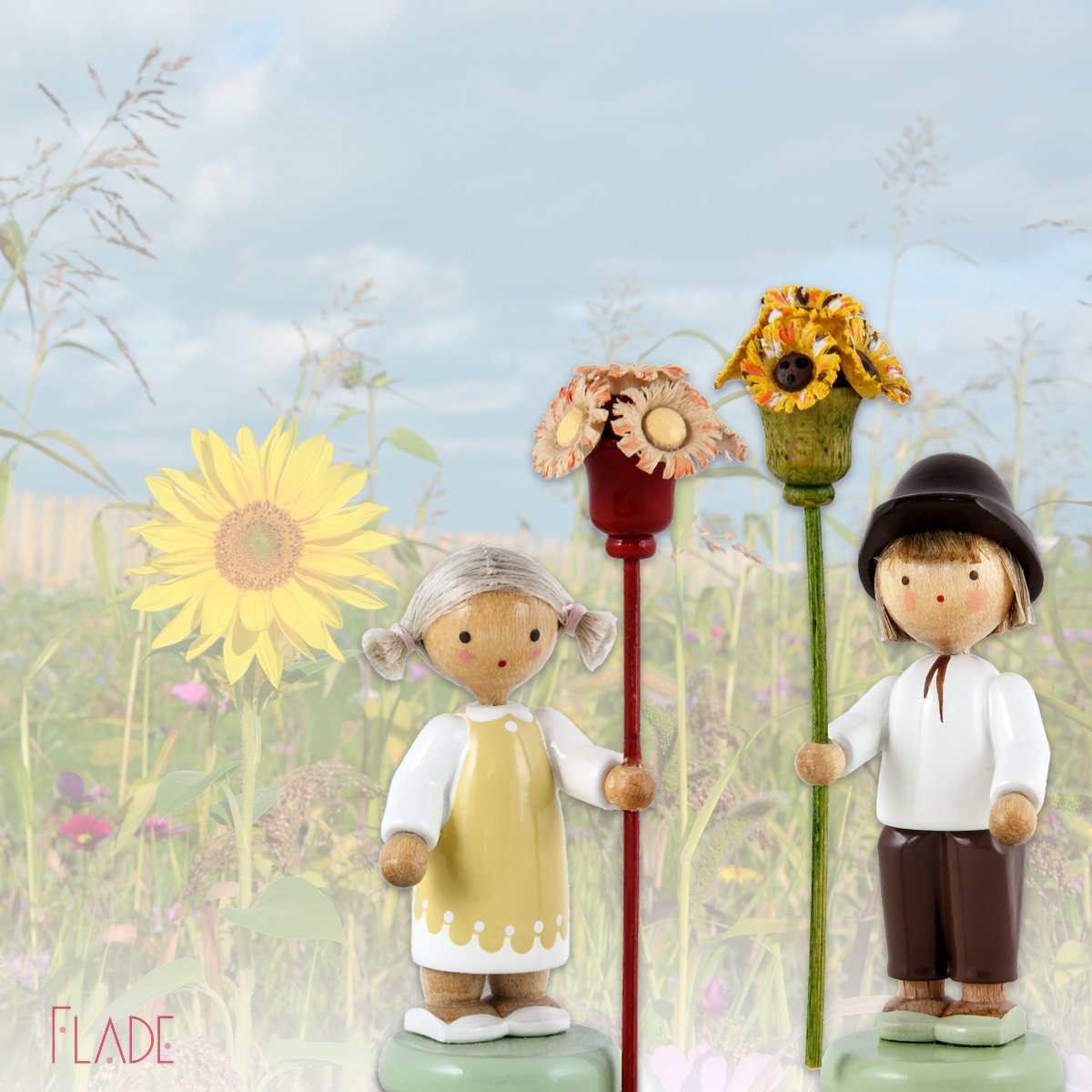 Es ist in vielen Volkskulturen und zu verschiedenen Anlässen ein schöner Brauch, an einem Stab Blüten zu befestigen. Bei uns in Sachsen gibt es das bei den Sorben. Mir haben die Bilder von den sorbischen Hochzeiten, auf denen man solche Blütenzepter sehen kann, unheimlich gut gefallen. So entstanden das Mädchen und der Junge mit Blütenzepter. Ein hübsches Gratulantenpärchen.