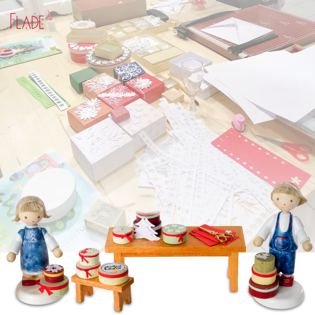 Spanschachteln zu verzieren, macht ungeheuren Spass. Malen, kleben, tupfen. Mit Farbe, mit Bändern, mit gestanzten Papierblüten und Sternen, der Fantasie sind keine Grenzen gesetzt. Das kleine Mädchen hat viel Freude an ihrer Arbeit.