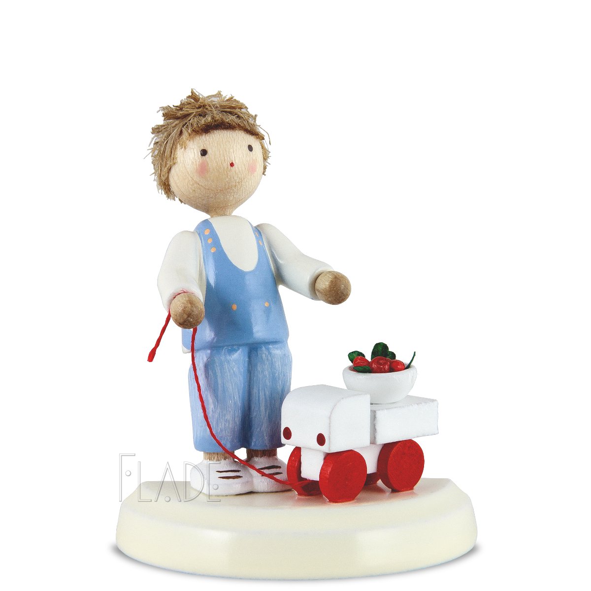 Im Garten meiner Großeltern stand ein großer Kirschbaum. Im Juni trug er dicke, feste “Knorpelkirschen”. Jedes Jahr denke ich an den Baum, und ich glaube, er trägt immer noch so üppig. Der kleine FLADE-Junge hilft bei der Ernte und hat eine randvolle Schüssel auf sein Auto geladen, um es in die Küche zu fahren. Oder hat er sich die Kirschen in die Taschen seiner Latzhose gesteckt?