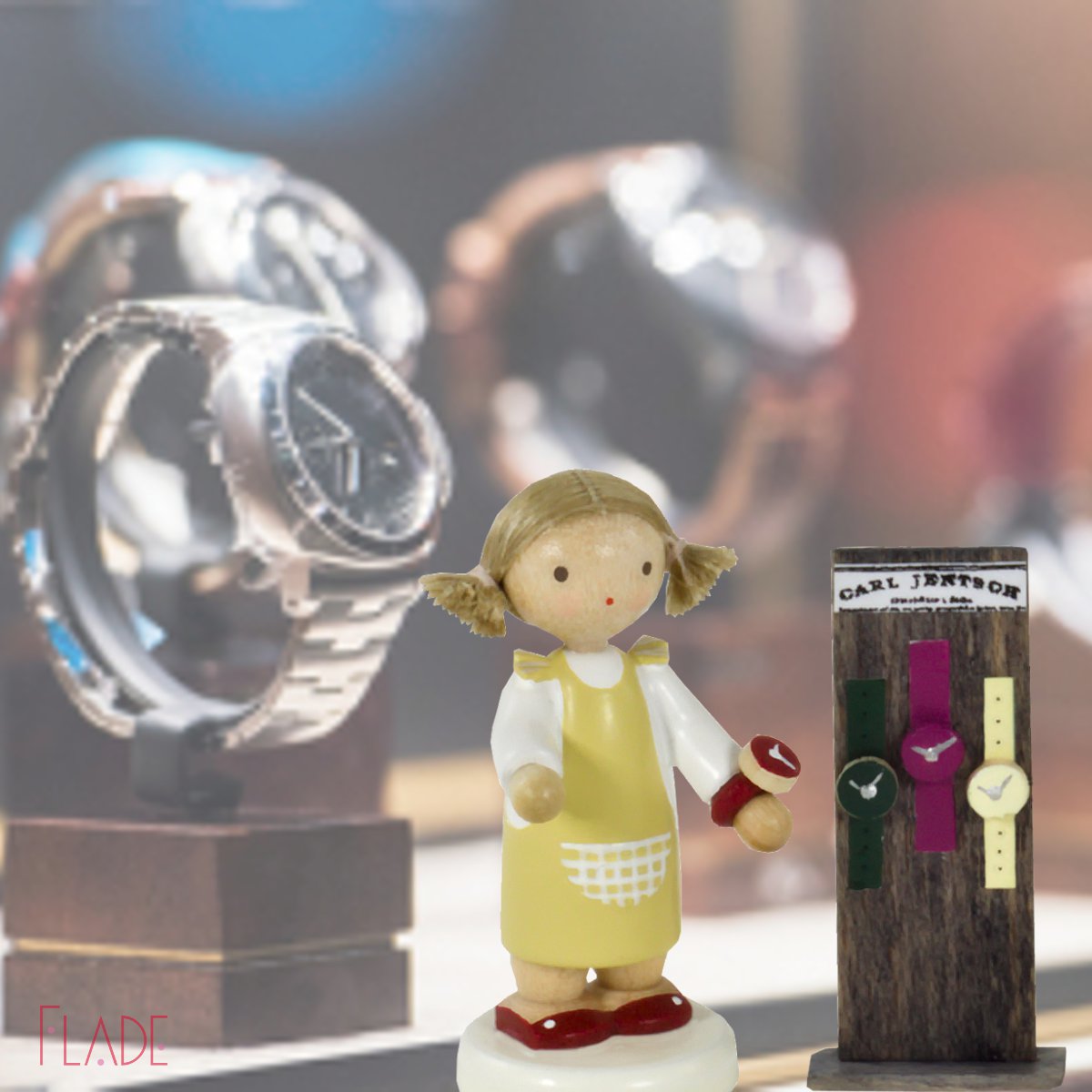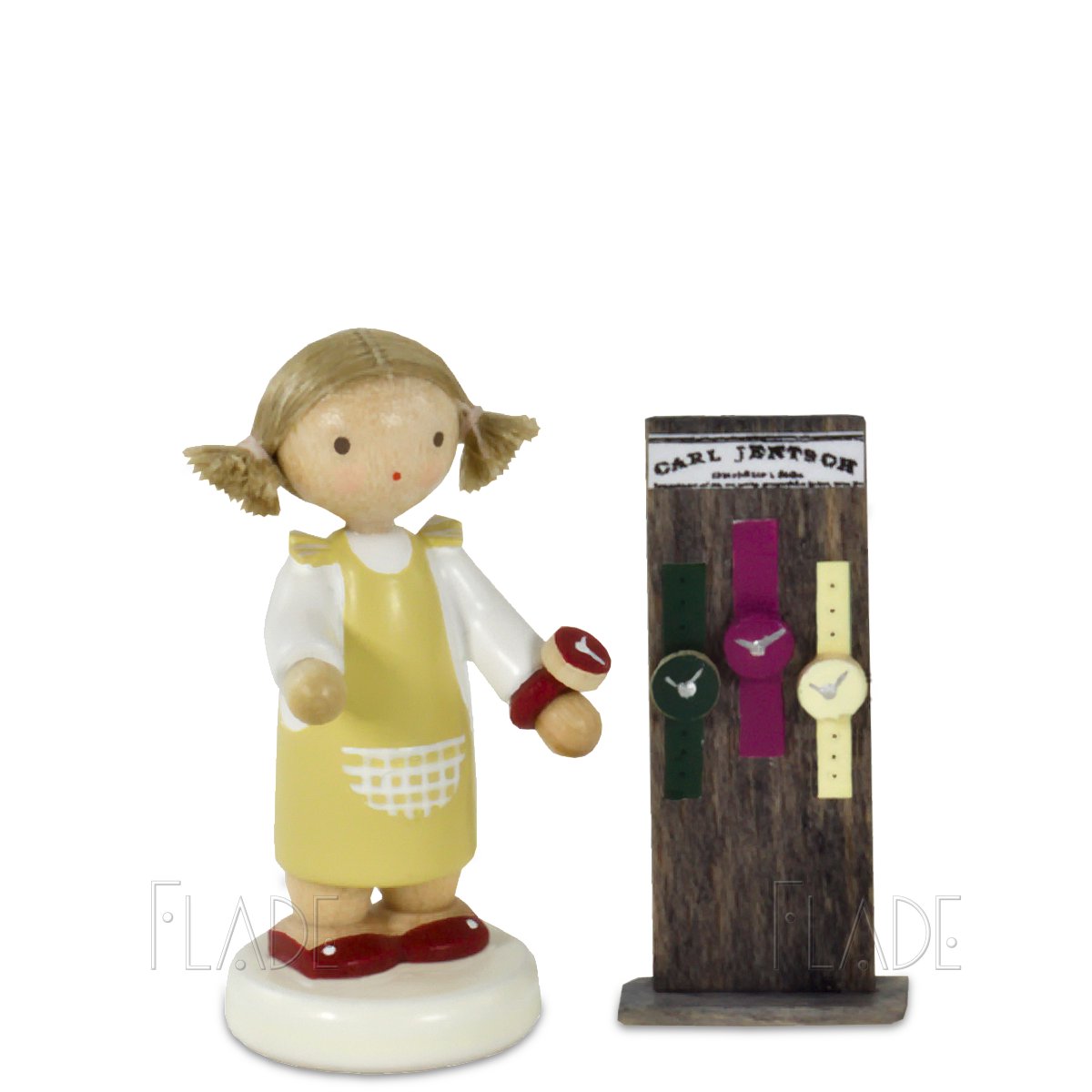 Zu dem Artikel gehören das Mädchen und der Aufsteller mit Armbanduhren.