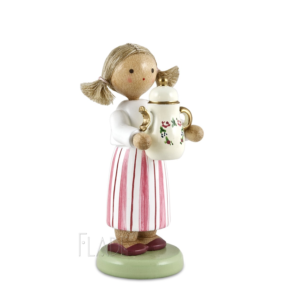 Die Sachsen lieben Kaffee, dafür sind sie berühmt. Und berühmt sind die Sachsen auch für ihr Porzellan, das ja hier erfunden wurde. Eine solche fein bemalte Kaffeekanne trägt das FLADE Mädchen ganz vorsichtig und …