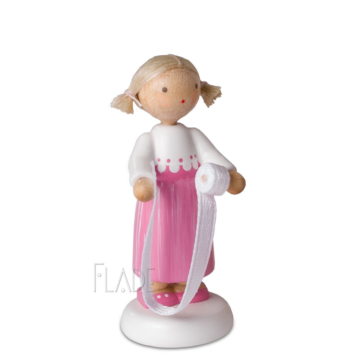 Feinstes Satinband befindet sich auf der Rolle. Ob das Mädchen gerade etwas abmisst, um den Saum eines Sommerkleides zu verzieren? Oder ist das ein Schmuckband für einen Beutel oder eine Umhängetasche?