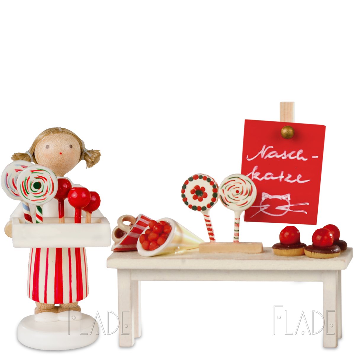 Erst die Bude macht den Marktstand komplett. Fast wie eine Markise spannt sich das gestreifte Dach über der Auslage. Im Hintergrund findet man noch eins der wichtigsten Werkzeuge der Stoffhändlerin, die große Stoffschere, mit der man ganz gerade schneiden kann.