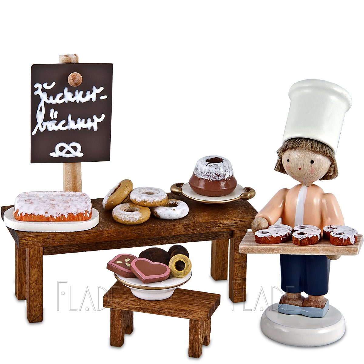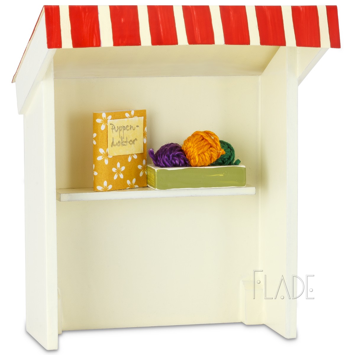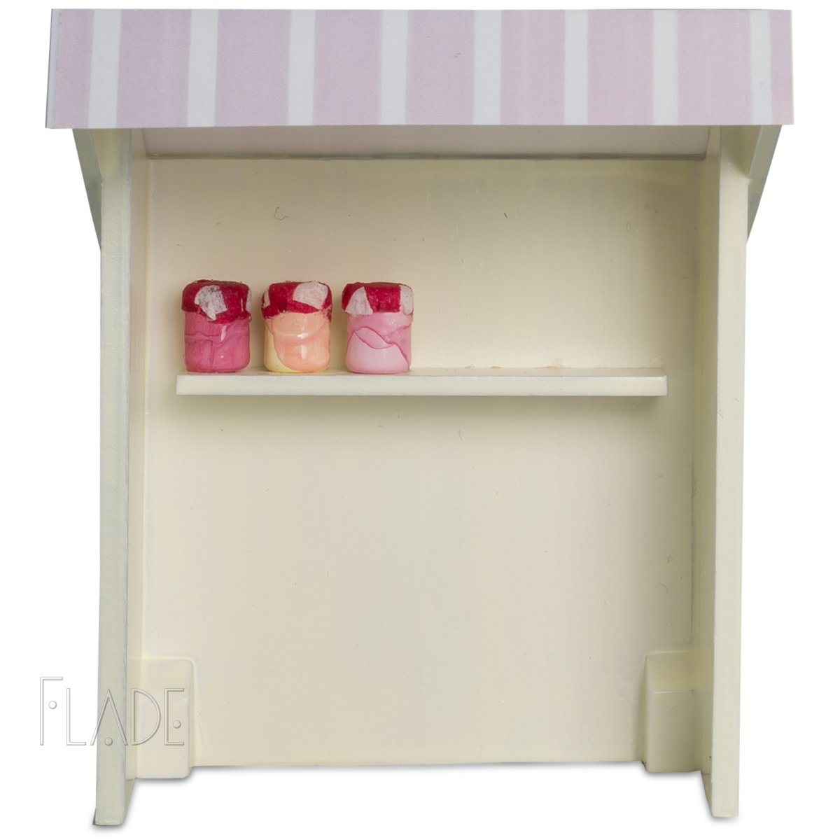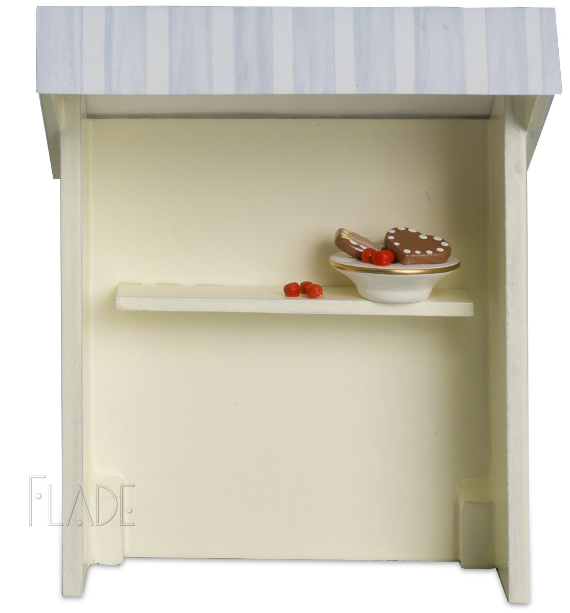Auch die Zuckerbäckerei hat ein “Häuschen” bekommen. Jetzt kann aus allen Marktständen ein richtiger Wochenmarkt entstehen, denn jeder unserer Marktstände hat nun eine Bude. Und jede Bude hat ein für den Verkaufsstand farblich abgestimmtes Dach und eine passende Miniatur auf dem Wandbrett. Dort ist noch Platz für eine weitere winzige Kleinigkeit.