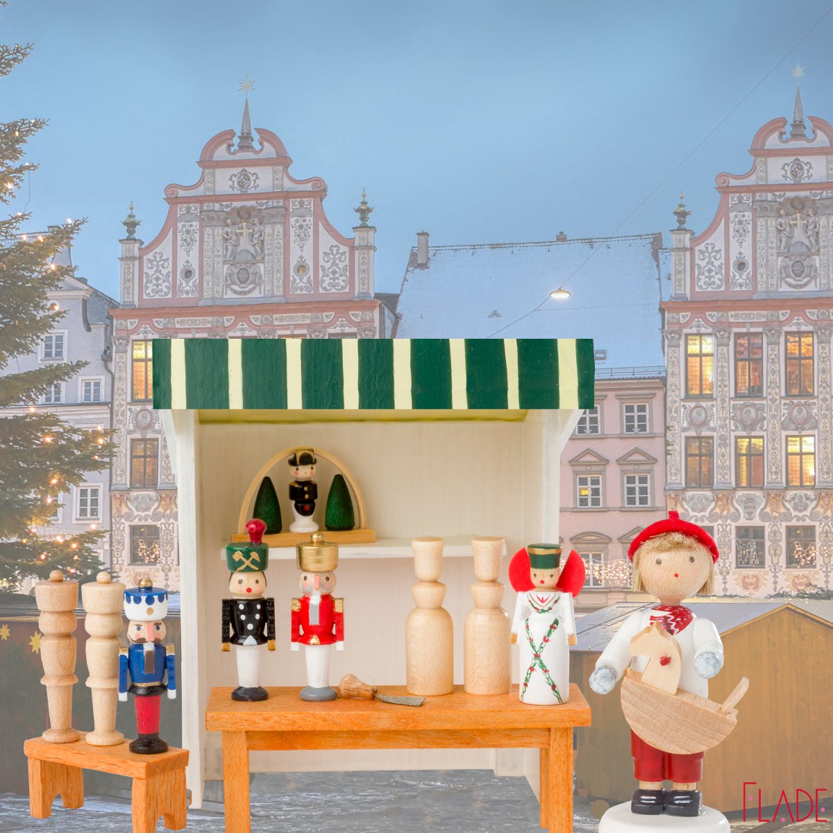 Der Spielzeugmacher auf dem Weihnachtsmarkt. Das Motiv ist wohl schon dutzende Male umgesetzt worden. Vor allem die Seiffener Handwerker haben mit ihrer eigenen Handschrift “sich selbst” und ihr Tun abgebildet. Dass es nun auch einen FLADE-Spielzeugmacher gibt, daran ist Kathrinchen Zimtstern schuld. Das vorwitzige Engelchen hat meinen Blick auf unsere erzgebirgische Figurenwelt verändert. Seitdem ist der Spielzeugmacher ein Lebenskünstler für mich.