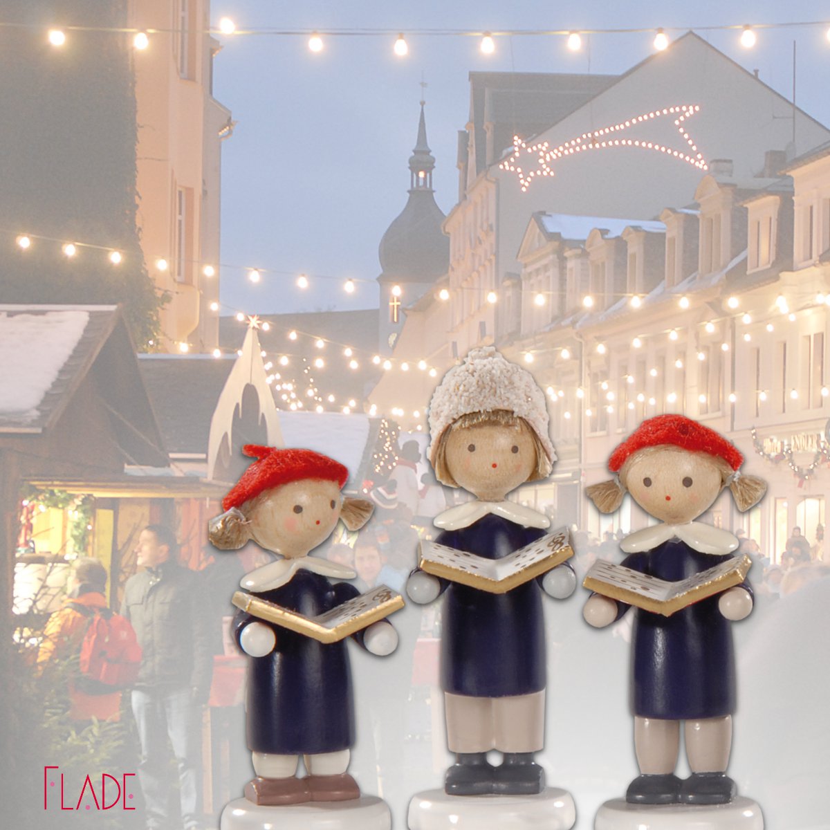 Die FLADE Kurrendekinder entstanden auf Wunsch und Anregung einer langjährigen Kundin aus dem Badischen. Ich hatte mich ein bisschen schwer getan mit den “Schwarzkitteln”, denn eigentlich tragen die Kinder aus der jungen Gemeinde ja schwarze Umhänge über ihren Anoraks und besuchen Menschen, die nicht zum Gottesdienst kommen können. Ich habe mit der Dame einen Kompromiss ausgehandelt. Blaue Mäntel sollte sie bekommen, die Olbernhauer Kurrende.