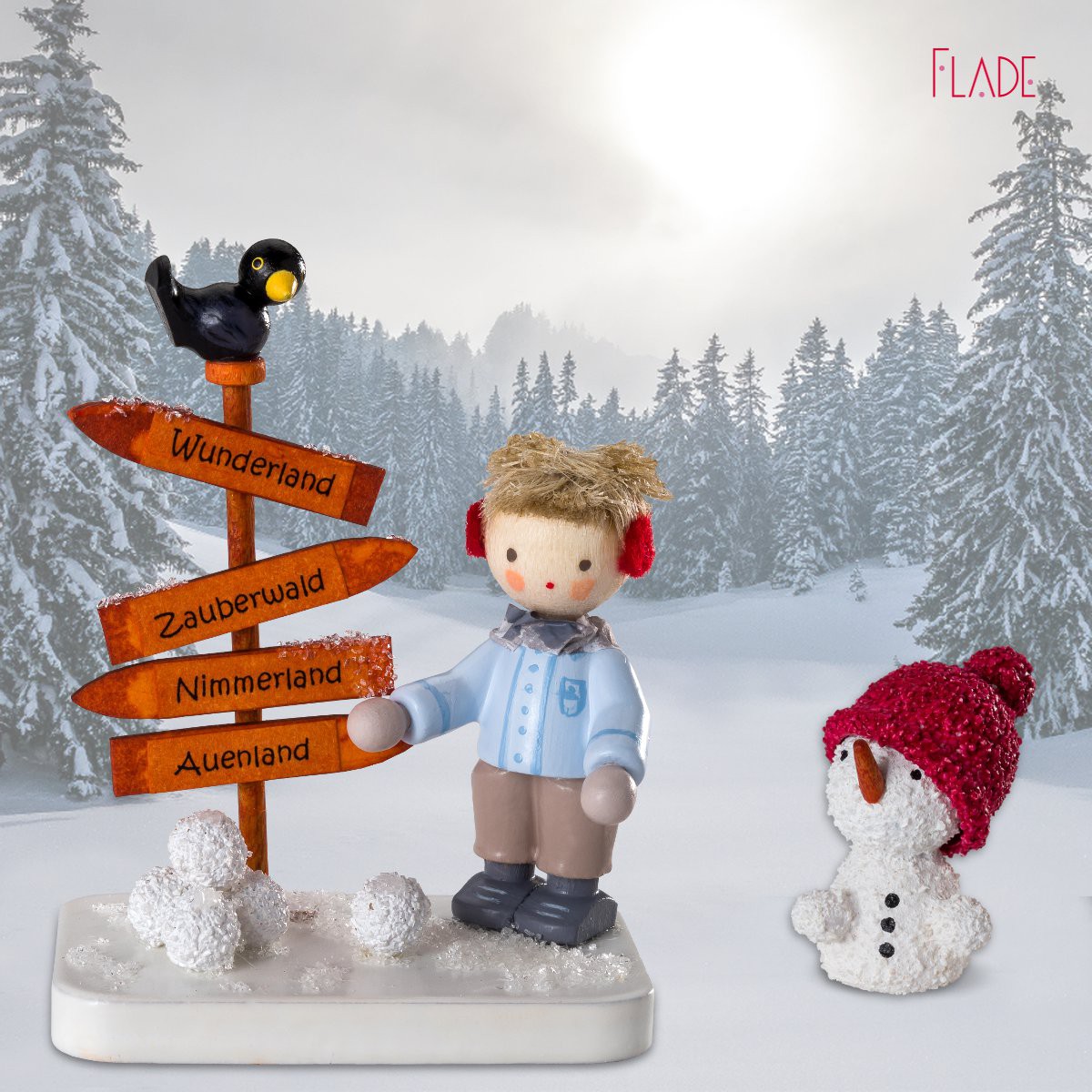 „Schneemann bau´n und Schneeballschlacht, Winter ist so schön…“ Das Kinderlied könnte Pate gestanden haben. Der kleine Junge hat vorgesorgt und sich einen kleinen Berg Schneebälle zurechtgelegt. Hinter ihm steht ein sehr besonderer Wegweiser. Oh, wie gerne würde ich sofort los laufen ins Auenland, ins Wunderland oder ins Nimmerland. Am liebsten aber in den …