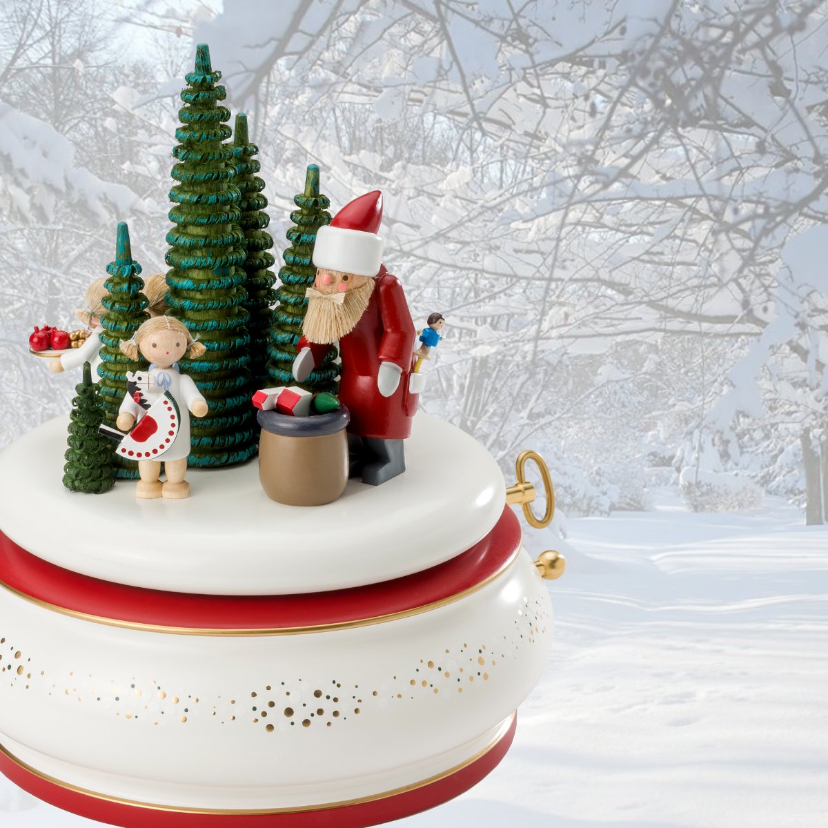 Die Spieldose “Der Weihnachtsmann kommt” war die erste FLADE-Spieldose überhaupt und ist schon lange ausverkauft. Der Weihnachtsmann als Gabenbringer wurde schmerzlich vermisst, aber nun ist er wieder da. Mit rotem Mantel, weißem Flachsbart und einem Sack voller Geschenke. Begleitet wird er von vier Engelchen und stimmt uns auf das bevorstehende Weihnachtsfest ein.