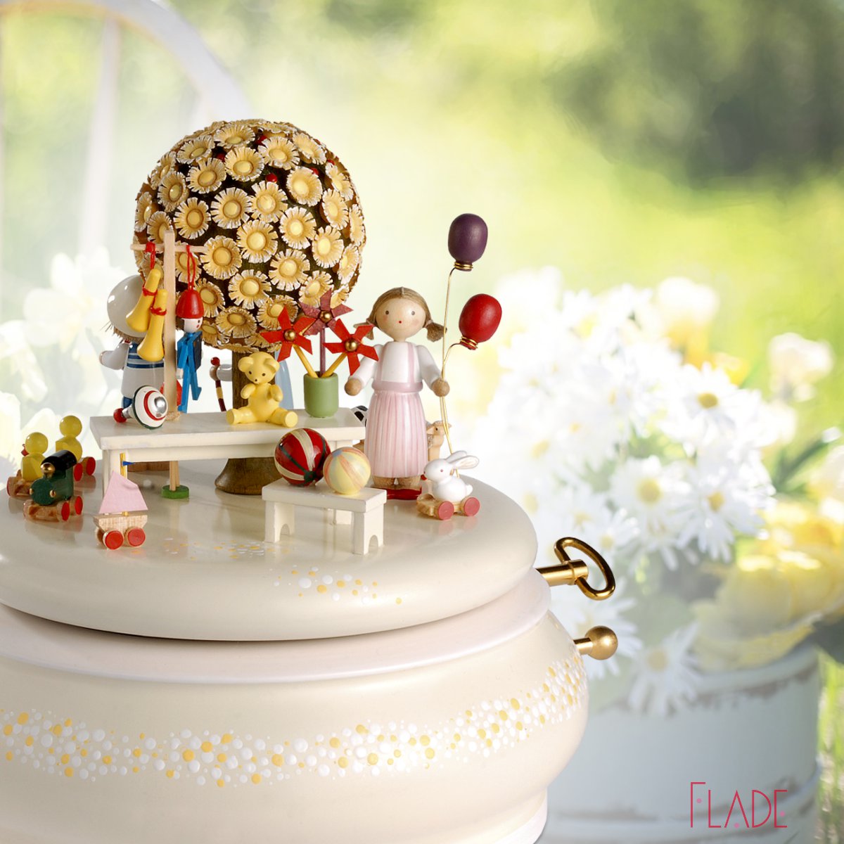 Zum 20. Firmenjubiläum unserer Manufaktur habe ich die Spieldose “Ein Sommertag” gestaltet. All die vielen nostalgischen Spielzeuge, die unsere Flachshaarkinder und Engelchen aus den Anfangsjahren bei sich haben, sind darauf zu sehen. Auch die kleinen Entchen und Häschen, die ich so sehr liebe, der Teddy und die schönen Bälle. Luftballons steigen in den Sommerhimmel, ein Springseil surrt durch die Luft. Kindheit, Sommer, Unbeschwertheit, Leichtigkeit. Heute und für immer. Für meine Kinder und für alle auf dieser schönen Welt.