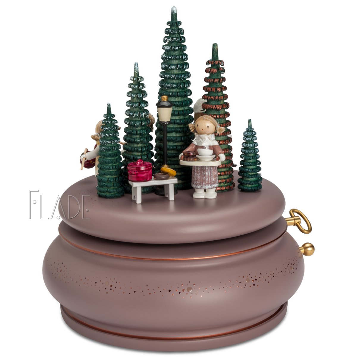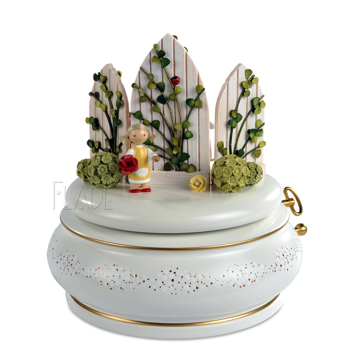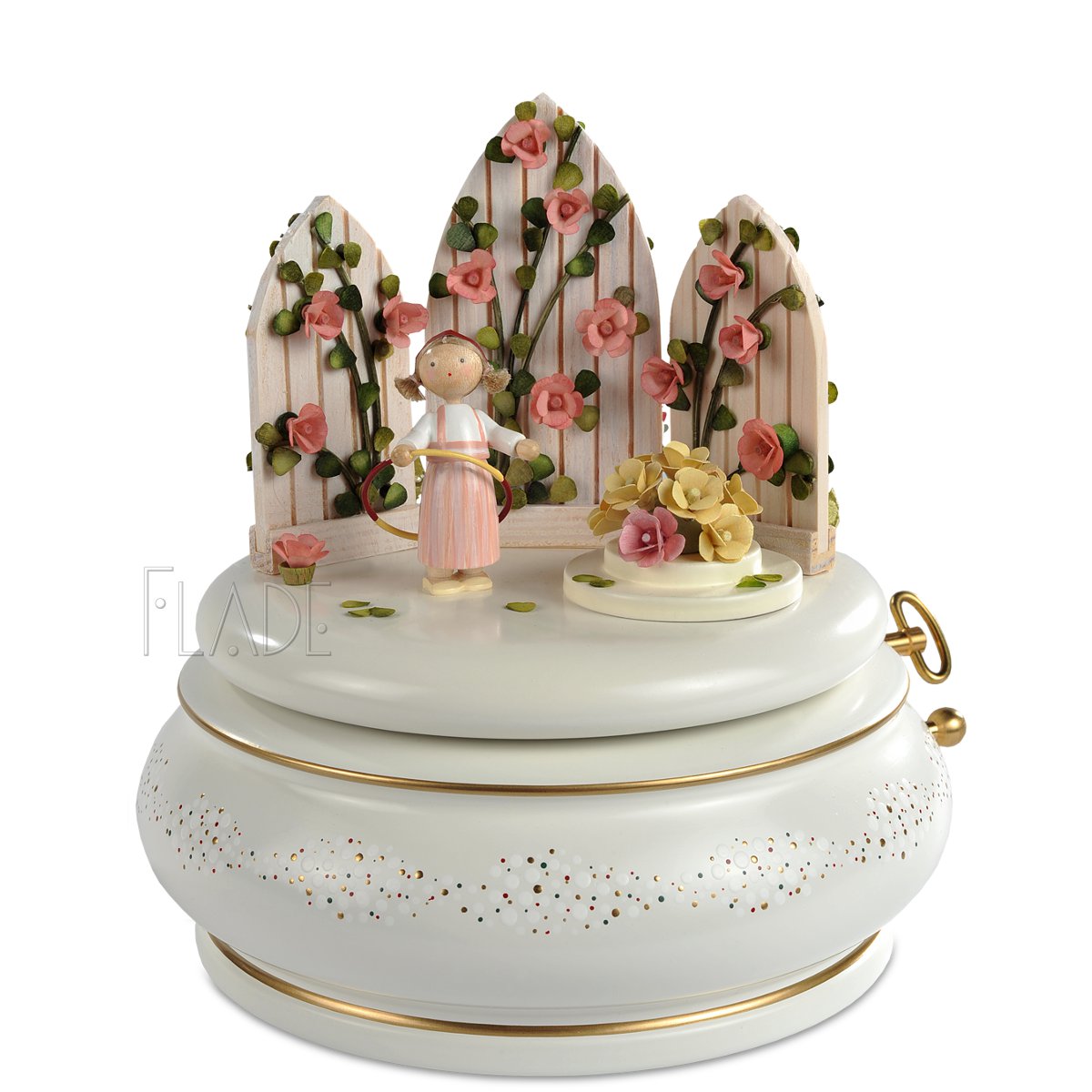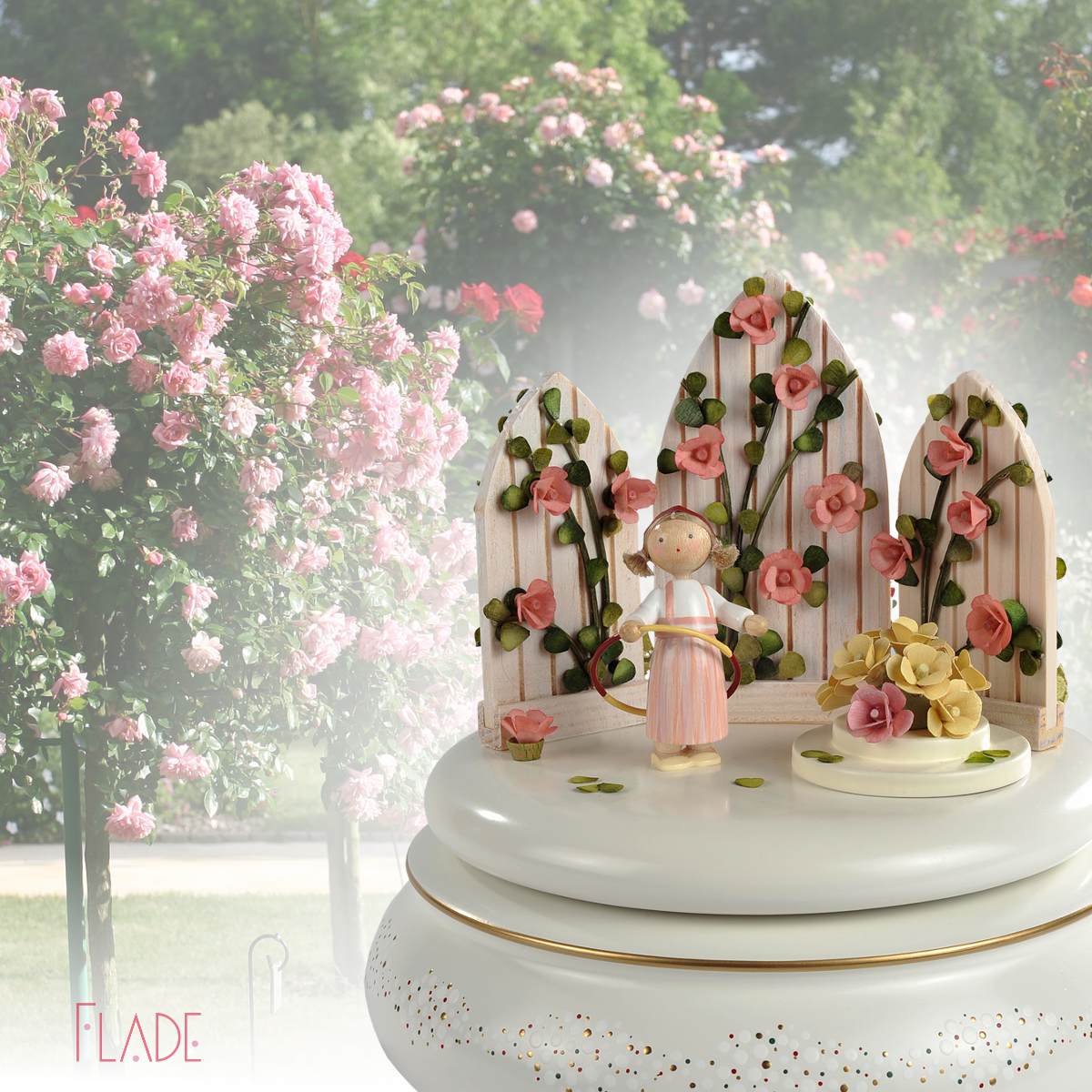 Der geheime Garten” von Frances Hodgson Burnett lieferte die Idee für die Spieldose “Im Rosengarten”. Ich hatte das bezaubernd illustrierte Buch auf einer Gartenschau entdeckt und war angetan von der zarten Geschichte über Freundschaft und über die typisch englische Liebe zu romantischen Gärten. Diesem Zauber kann ich mich auch nicht entziehen und habe “englische Rosen” aus hölzernen Blütenblättern geformt. Zart rosé, gefüllt, duftend, ein Symbol für zärtliche Liebe. Ein Rosengarten ist ein ganz besonderer Ort und wenn sich das romantische Motiv zur Musik zu drehen beginnt, leuchten nicht nur Kinderaugen.