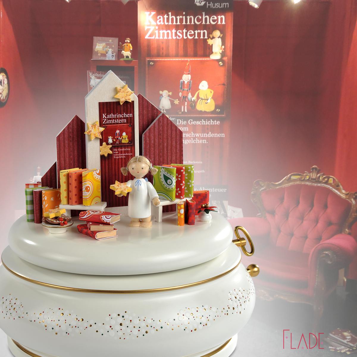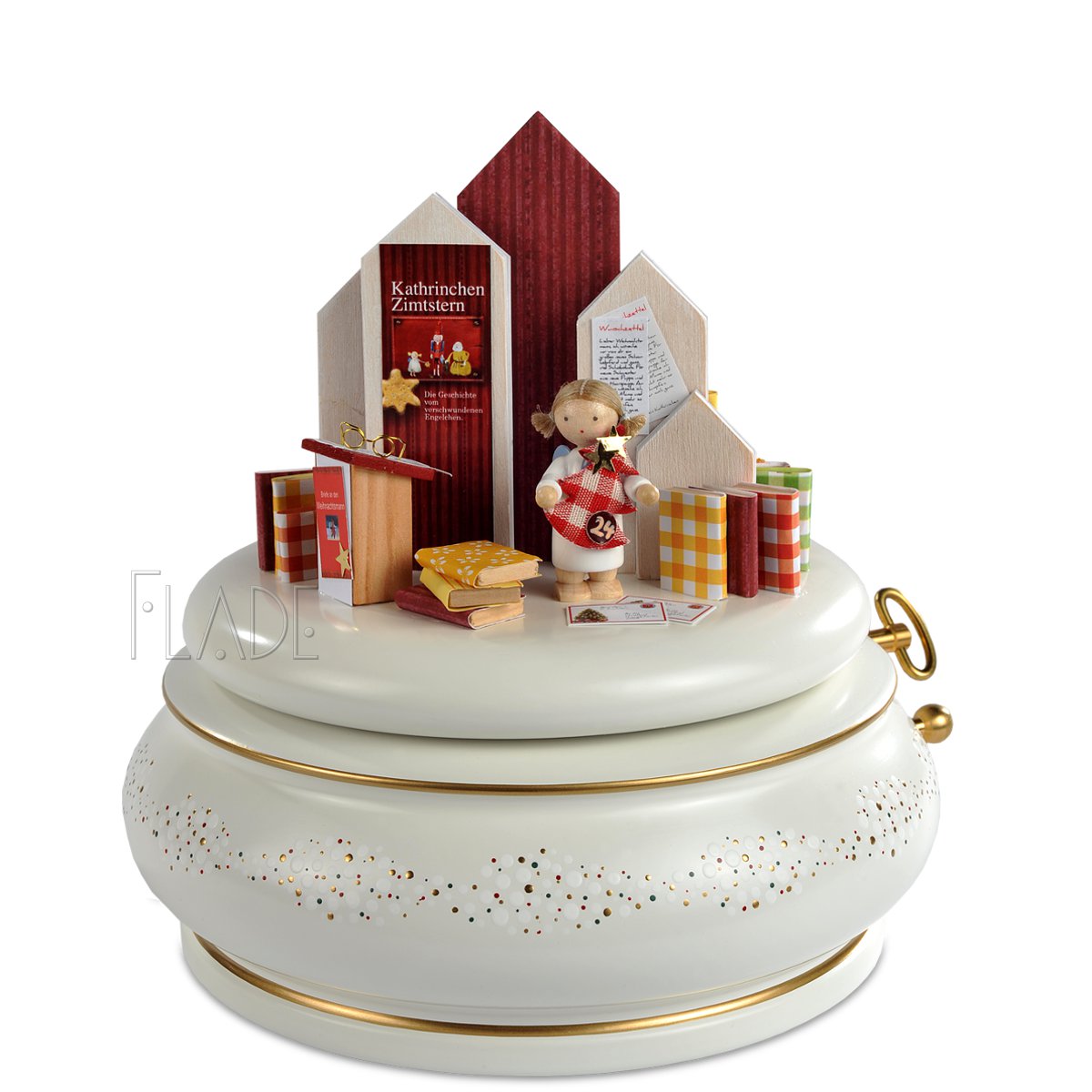 Kathrinchen Zimtstern ist ein fröhlicher und mutiger kleiner Engel, abenteuerlustig und unerschrocken und könnte mit Pippi Langstrumpf verwandt sein. Auch Kathrinchen Zimtstern ist eine Kinderbuch-Figur, die seit 2012 tausende kleine und große Kinder verzaubert hat. Es war der Wunsch einer Bibliothekarin, Kathrinchen auf eine Spieldose zu bringen. Deshalb steht sie da inmitten vieler Bücher und erzählt uns über die unsterbliche Magie der Geschichten, über spannende Abenteuer und Fantasiereisen in ferne Welten, die man nur mit Büchern erleben kann.