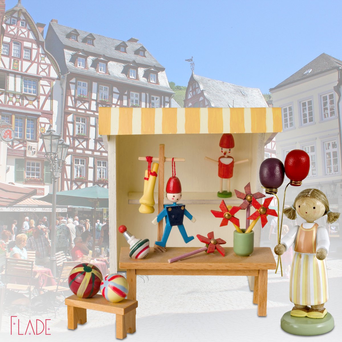 Brummkreisel, Windmühlen, Bälle, ein Hampelmann… Die Spielzeughändlerin hat lauter schöne Spielzeuge für Ihre Kunden. Die gehen nicht kaputt und halten eine ganze Kindheit lang. Mindestens. Manchmal sogar so lange, dass die Kinder dann mit ihren Kindern damit spielen. Schön, oder?