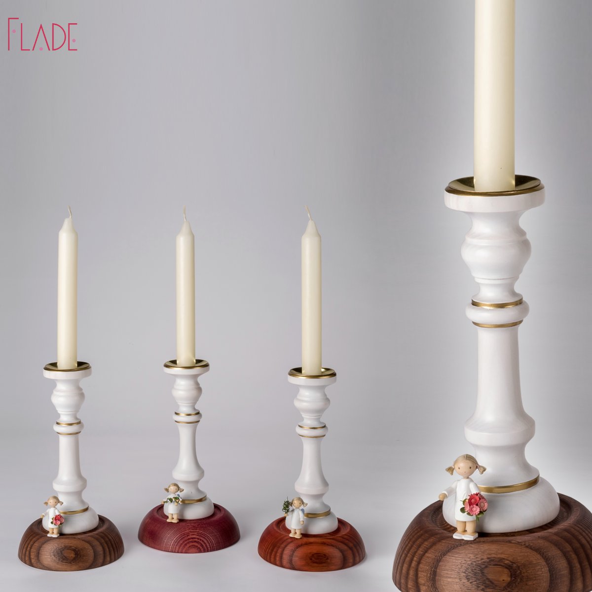 Ein Leuchter kann ein Lebensbegleiter sein. Auf dem handgedrechselten Sockel aus Esche, der im Farbton Nußbaum geölt ist, steht ein Mädchen mit Blumenstrauß als Symbol für den Zauber der Jahreszeiten. Bei mir zuhause steht ein solcher Tafelleuchter jahrein, jahraus auf dem Esstisch. Die Kerze wird zu jeder Mahlzeit angezündet und das kleine Mädchen erinnert daran, worum es im Leben geht.