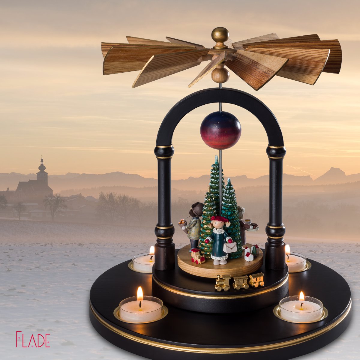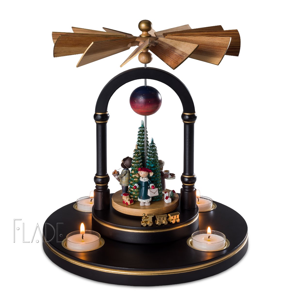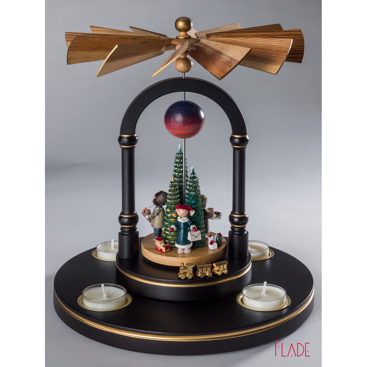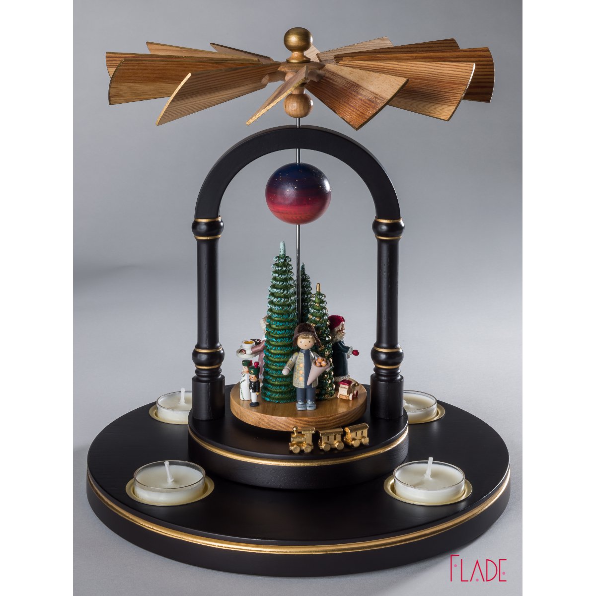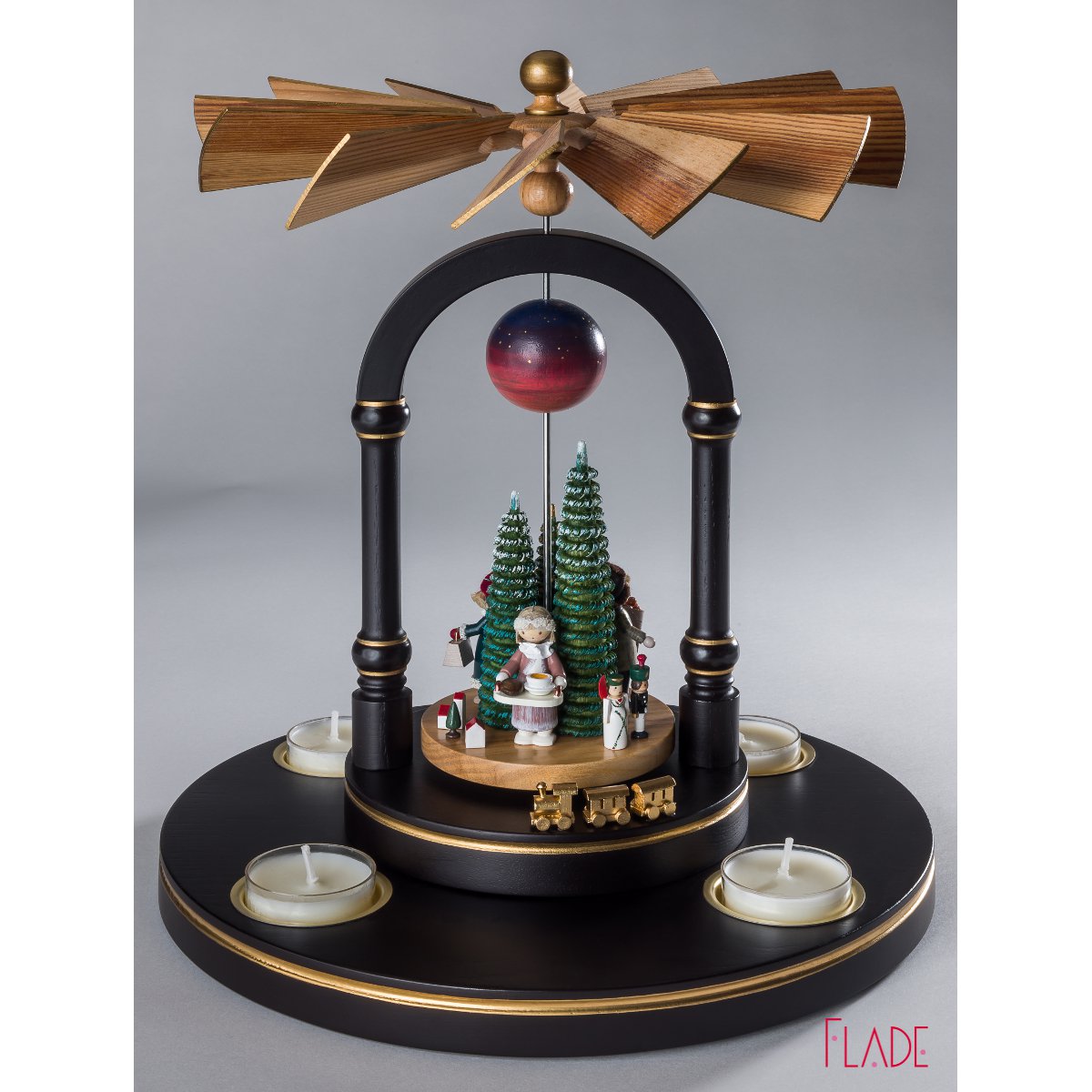 Es ist nicht zu übersehen, diese Pyramide hat ein junger Mann gestaltet. Mein Sohn Florian wollte eine fast schwarze, die sich nur mit der Wärme von Teelichtern bewegt und auf der sich elegant und städtisch gekleidete Kinder drehen. Beeinflusst wurde sein Wunsch von dem überwältigenden Erfolg der Spieldose “Russischer Winter”. Schwarz mit goldenen Akzenten. Mit Kindern, die eine ganz eigene Geschichte erzählen. Jetzt gibt es also eine Fortsetzung der “Winterreise”. Und genau deshalb haben wir der Pyramide diesen Namen gegeben.