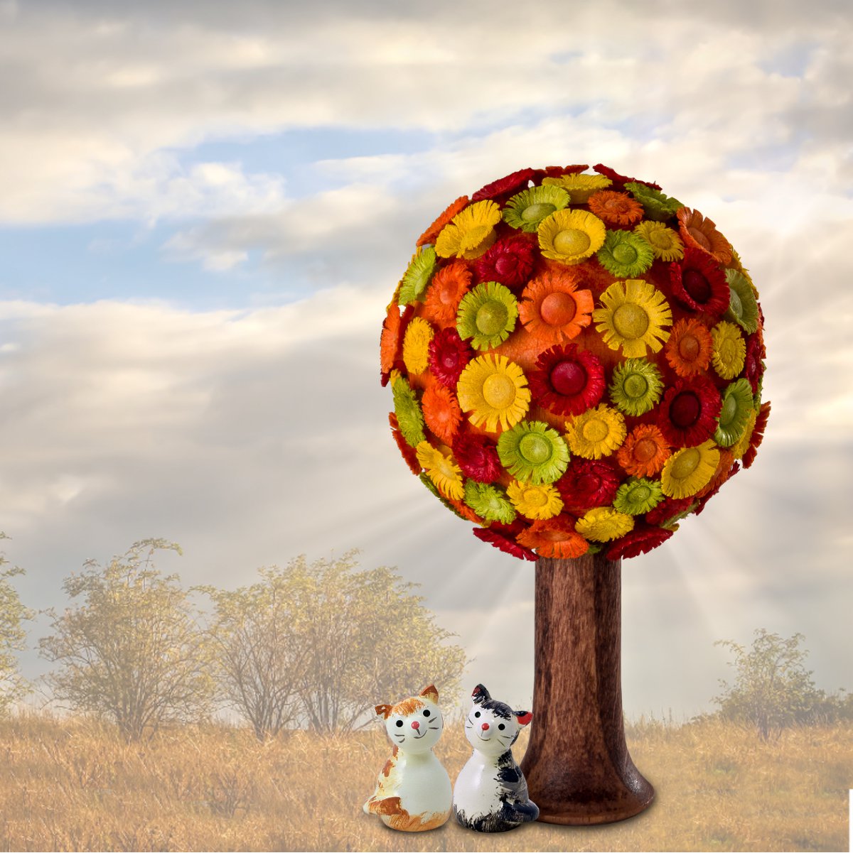 Sonnenblume im Topf, Vogelscheuche, zwei Kätzchen