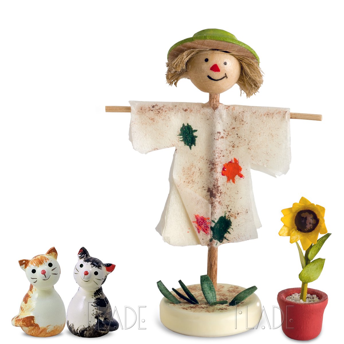 Vogelscheuche, zwei Kätzchen & Sonnenblume im Topf