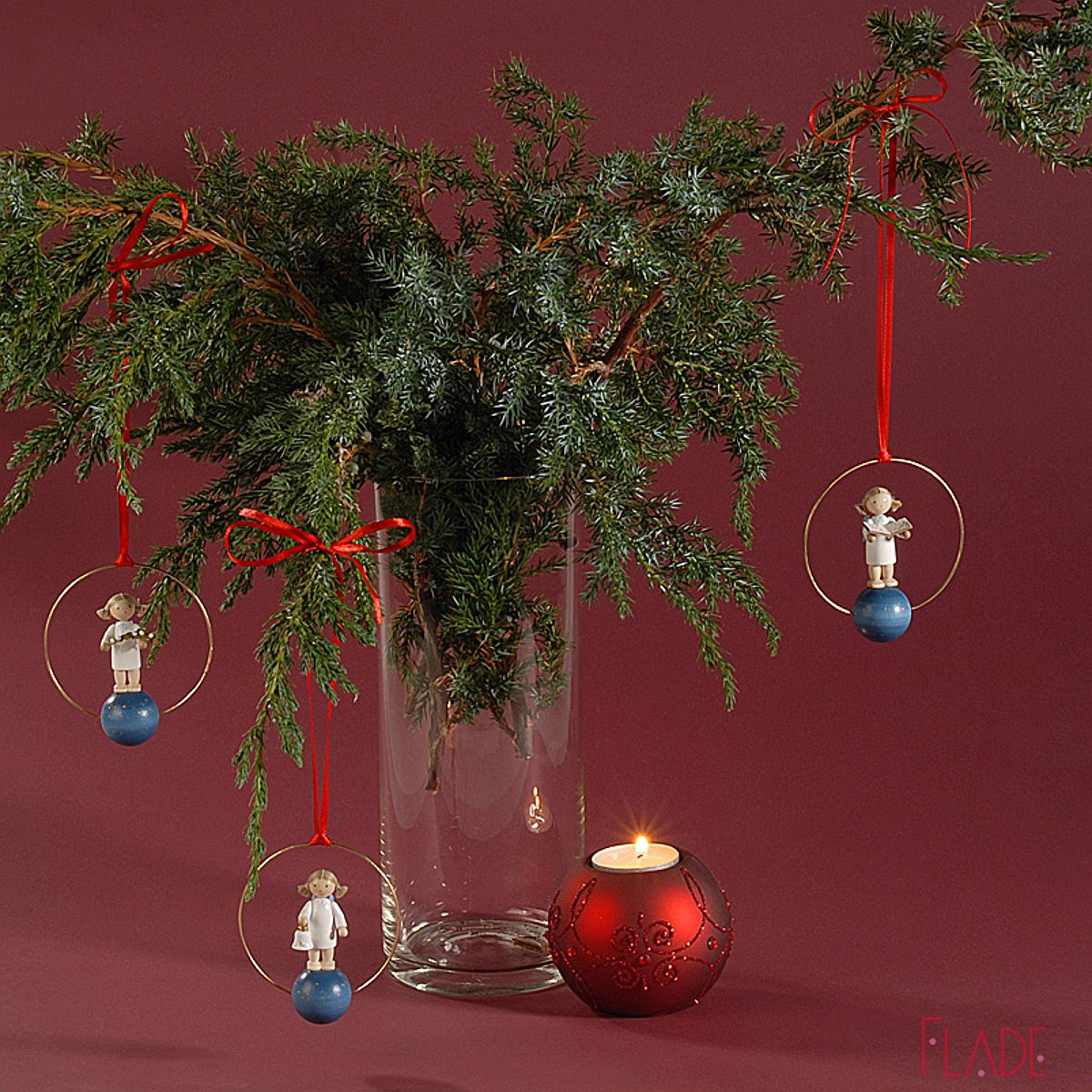 Der Engel hält ein Notenbuch in den Händen und glänzt und leuchtet festlich im Fenster oder an einem Zweig.