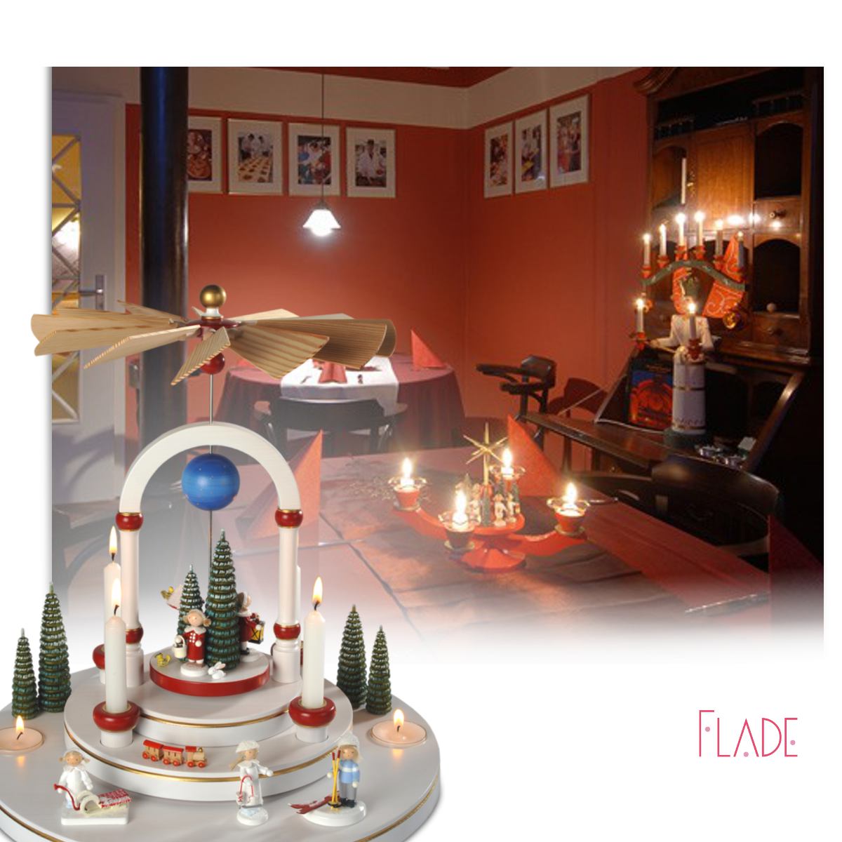 Jede FLADE Pyramide kann mit einer größeren zusätzlich gedrechselten Scheibe ausgestattet werden, die genügend Platz für weitere FLADE Engelchen und Kinder, Bäume oder kleine Miniaturen bietet. Die Scheibe hat zwei eingelassende Teelichtbohrungen. So kann sich die Pyramide auch nur mit den beiden Teelichtern drehen.